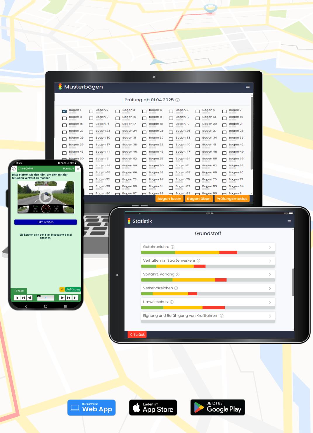 Deine App für Autoführerschein Prüfungsfragen – Flexibel und mobil: Die Theorie App für Führerschein-Prüflinge ist plattformübergreifend verfügbar. Egal ob auf dem iPhone, einem Android-Tablet oder direkt im Browser am Laptop: Dein Lernfortschritt wird in Echtzeit synchronisiert. So kannst du jederzeit und überall an deinen Autoführerschein Prüfungsfragen arbeiten und jede freie Minute effektiv nutzen.