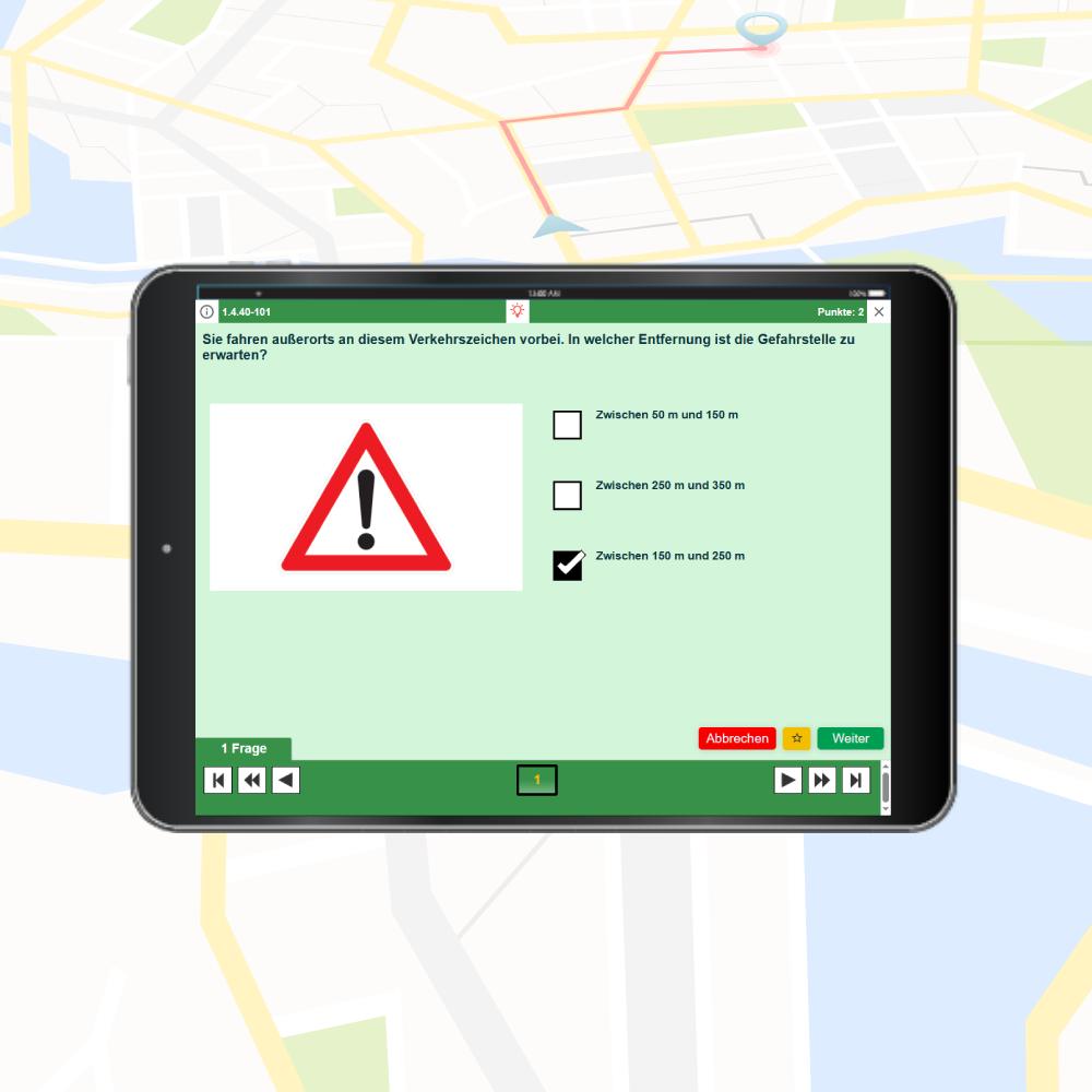 Teste dein Wissen unter identischen Bedingungen – exakt wie beim TÜV – mit dem speziellen Modus „Prüfungssimulation“. Mein Tipp: Suche dir einen ruhigen Ort für maximale Konzentration, starte die Session und beantworte die 30 Fragen in 30 Minuten. Am Ende erfährst du sofort, ob du bereit für die echte Theorieprüfung bist.