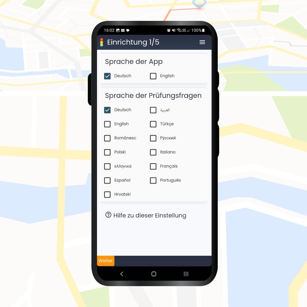 Egal, ob du direkt auf Deutsch lernen willst oder dich in einer anderen Sprache einfach wohler fühlst – wir haben sie alle! In der App kannst du jederzeit zwischen allen 12 gesetzlich zugelassenen Prüfungssprachen (Deutsch, Englisch, Französisch, Arabisch, Russisch, Türkisch, Spanisch, Italienisch, Polnisch, Griechisch, Portugiesisch und Kroatisch) wählen.